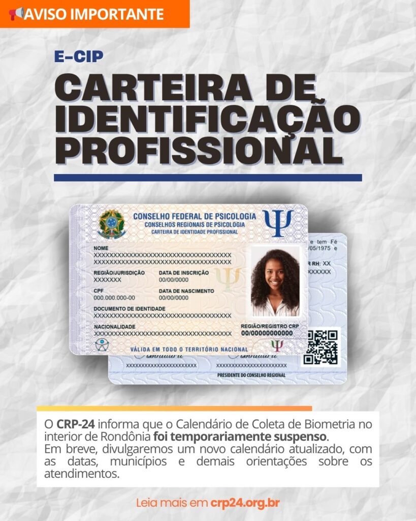 O Conselho Regional de Psicologia da 24ª Região (CRP-24) informa que o Calendário de Coleta de Biometria previsto para municípios do interior de Rondônia foi temporariamente suspenso.
