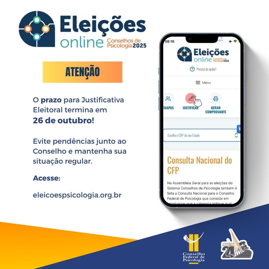 O Conselho Regional de Psicologia da 24ª Região (CRP-24) informa às(aos) profissionais que o prazo para justificativa de voto nas Eleições do Sistema Conselhos de Psicologia termina no dia 26 de outubro de 2025.